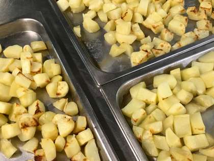 「ミートボールのケチャップ煮」は、肉だんごと野菜をケチャップで味付けした洋風の煮ものです。塩で味を整えたシンプルな「やきじゃが」との組み合わせは、好評でした。
