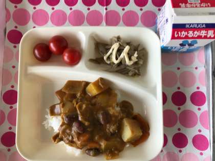 「豚肉と金時豆のカレーライス」の金時豆は、ドライパックの金時豆を使用しています。昨年度から給食に登場した好評なメニューです。