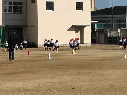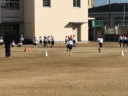 今日の体育は、サッカーボールを使ってドリブルしながら走ったり、リレーのように走ったりしました。