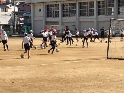 一人一球のボールを使い、ドリブルをしながら前の人を追いかけます。最初はぶつかったりもしましたが、ちゃんと前を見ながらドリブルをすると、ぶつかることもなくなりました。
