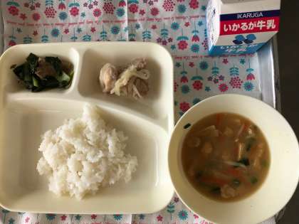 「鶏肉のゆず塩焼き」はゆず果汁と塩で鶏肉と玉ねぎを味付けした食べやすいメニューです。「さつまいものみそ汁」はさつまいもをたくさん使用しているので、いつものみそ汁よりも少し甘いみそ汁です。「小松菜の煮びたし」は、豚肉が入っていて食べやすくなっています。
