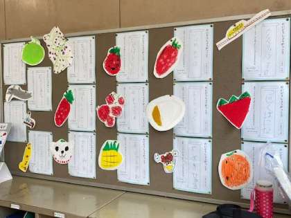 1年生の教室では、「大桐小学校で初めて書いた自分の名前」を掲示しています。丁寧にひらがなで書くことができました。また、パイナップルやイチゴなどの絵も描いており可愛く仕上がっています。