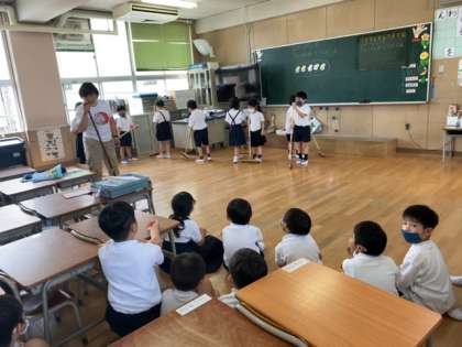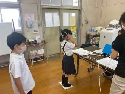 分散登校も終わり、今週からは通常登校です。子どもたちも新しいクラスでようやくスタートできました。今日は児童朝会があったので、始業式も兼ねて実施いたしました。また、聴力検査などの検診もスムーズに行われました。午後になり1年生の教室を見に行くと初の5時間授業と掃除を体験し、やや疲れが見えますが、日に日に成長が感じられます。