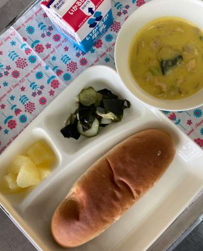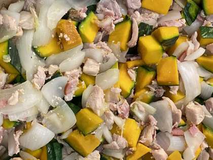「かぼちゃのクリームシチュー」はベーコンをからいりし、ワインで下味をつけた鶏肉、たまねぎを炒め、かぼちゃ、湯を加えて煮る。煮あがれば、マッシュルーム、別釜で作ったルウを加え、塩、こしょうで味付けして煮込み、むき枝豆を加え、最後に牛乳、クリームを加えて煮ます。
