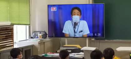 本校では、3密を避けるために毎週月曜日の児童朝会をテレビ中継で行っています。今日は熱中症についての話をしました。最近、急に暑くなり感染予防のためのマスクで熱中症にかかる児童が多いというニュースを見ました。本来、冷たい空気を吸って体を冷やす機能がマスクによって邪魔をされ、暖かい空気を吸うことによって熱がこもりやすくなります。苦しくなる前に友だちと距離をとり、マスクを外して深呼吸すると少しは楽になります。ご家庭でもお話ください。また、当番の先生からは「あいさつ」と「登下校時の安全」について話がありました。