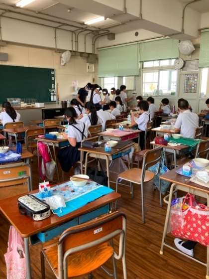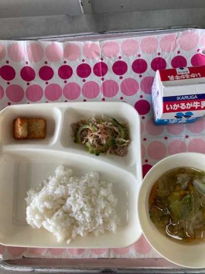 今日の給食のフォトは、6年2組です。ゴーヤチャンプルーもあつあげもごはんも、おかわりの行列です。