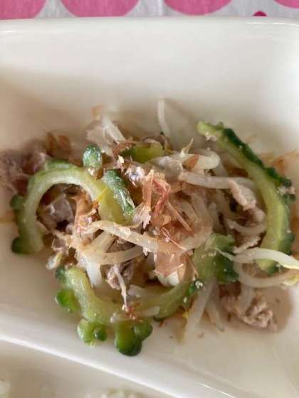 「ゴーヤチャンプルー」は、年に1回だけ7月に使用できる、にがうりを使った沖縄料理です。卵は使用していません。食べる前に小袋のかつおぶしをかけることで、風味とうま味を添えています。