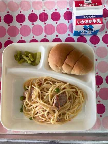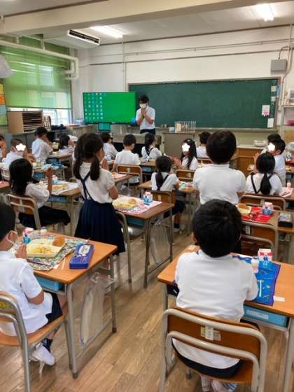 日直が「いただきます!」のあいさつをしてから、みんなで「いただきます!」をしました。