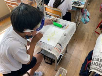 いろいろな技法の練習をしています。ストローで吹いたり筆を振ったりして画用紙に模様をつくっていますが、二度と同じ模様はできません。子どもたちは不思議なデザインを楽しみながら学習できました。