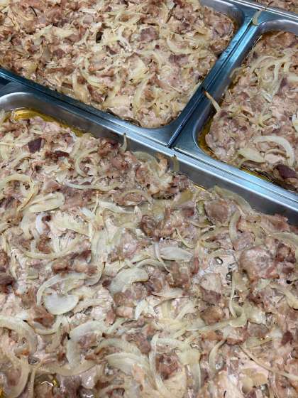 「豚肉のしょうが焼き」は、豚肉をしょうが汁、砂糖、料理酒、みりん、濃い口しょうゆ、綿実油で下味をつけ、玉ねぎと混ぜ合わせて焼き物機で焼きます。ごはんが進む献立です。
