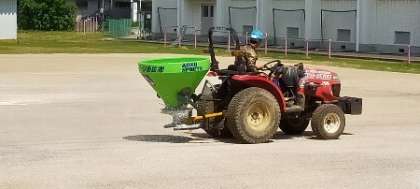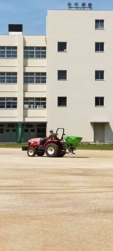 写真は、整地が終わって、小石がなくなったフカフカの運動場に、「にがり」をまいているところです。