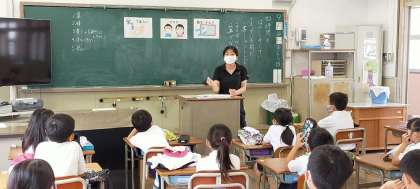 発育測定の際に、養護教諭の小原先生が全クラスをまわって、コロナウイルスの予防について授業をしています。今日最後の2年4組が終わりました。