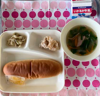 「鶏肉のからあげ」は、鶏肉にしょうが汁、にんにく、塩、こしょうで下味をつけ、でん粉をまぶし、菜種油で揚げます。児童に大人気のメニューです。