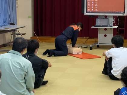 実習では、発見者(心臓マッサージを行う人)・AEDを持ってくる人・119番をする人に分かれて本番さながらの訓練を行いました。久しぶりの訓練ですが、すぐに感覚を取り戻してスムーズに訓練できました。