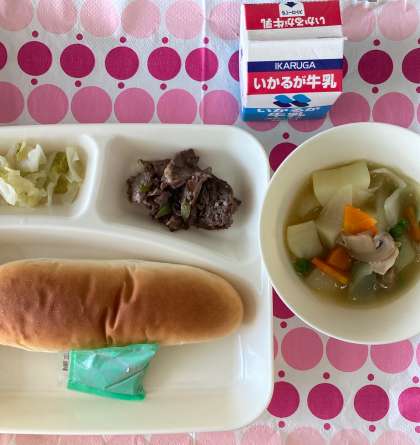 今日の給食のフォトは、2年4組です。おかわりもして、すべてのおかずが完食になっていました。