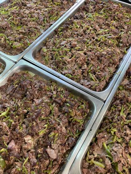 「牛乳の香味焼き」は、牛肉にワイン、塩、こしょう、オールスパイス、ウイスターソース、オリーブ油で下味をつけて、ピーマンと混ぜ合わせ焼き物機で焼きます。