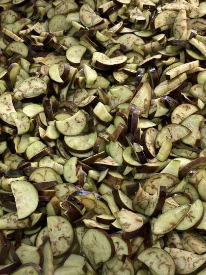 「マーボーなす」は牛ひき肉、豚ひき肉を主材に、旬のなすを使用した、児童に好評なメニューです。マーボーなすに使用するトウバンジャンは、油で炒めることで、風味が増します。