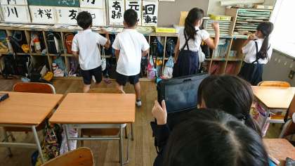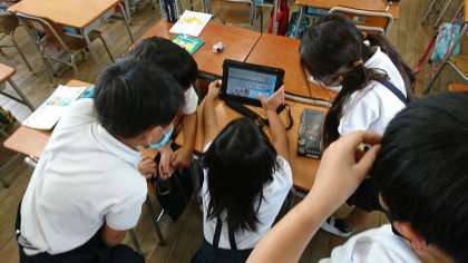 タブレットを活用した授業をしました。許可もなく嫌がっている人を撮らない、撮った写真や動画を勝手にインターネットに載せないなど、情報モラルの話を聞いた後はいよいよ実践です。カメラ(動画)の撮り方、撮った動画の見方を学び、今一番頑張っているダンスの練習に活用しようと取り組みました。