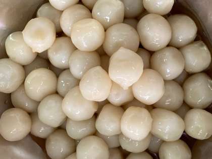 「みたらしだんご」は焼き物機で蒸した白玉だんごに、砂糖、濃い口しょうゆ、でん粉で作ったタレをからめます。