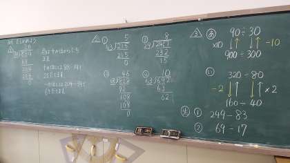 小学校の算数科の学習で、一番難しいといわれている「二けたでわるわり算」の学習がいよいよまとめに入ってきています。一学期に学習したわり算の筆算よりも、計算の手順が複雑になっていますが、順序通りに丁寧に計算していきます。