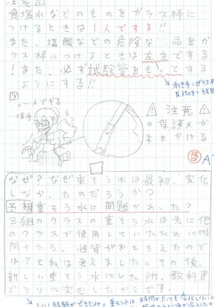 感想のところでもっとも多い記述は、「この実験をして、もっといろいろなことを詳しく調べたいと思いました。」や「今日の実験はとても楽しかったです。また、やりたいです。」という書き方です。これでは、どんなところが楽しかったのか、何について興味を持ち、何を調べたいと思ったのかわかりません。国語の作文と同じで、具体的に思ったことを書くようにするともっといいノートになりますよ。次のノートも楽しみにしています。