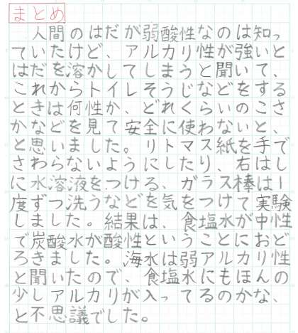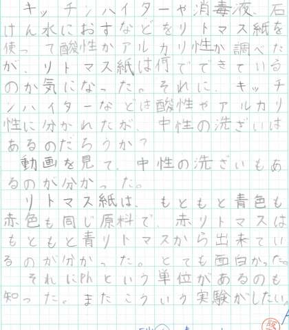 リトマス紙の色の変化については、ほとんどの子は「赤になった」「青になった」とだけ書かれていました。でも塩酸と炭酸水では、同じ「赤くなる」でも、色の鮮やかさや変化の速さが違ったと思います。まずは、それに気づくことができるか(観察力)。