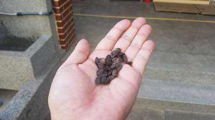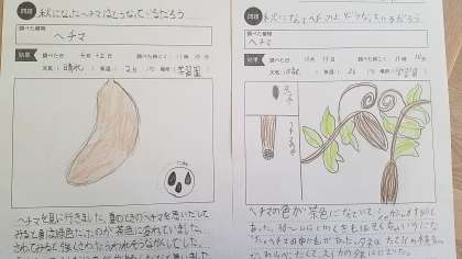 久しぶりの観察に子どもたちは興味津々!大きく茶色くなったヘチマに歓声があがっていました。実が破れてこぼれた種をきちんと拾い上げてくれました。