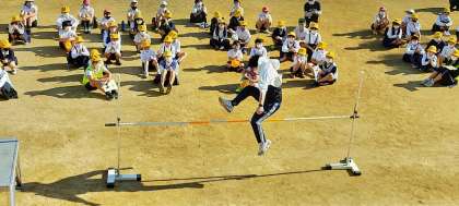 6年習熟の笠原先生が90cmのバーを跳べるかどうか、1発勝負です。