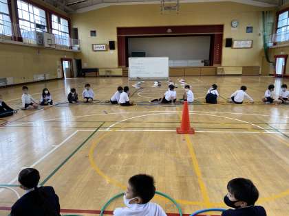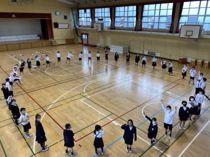 【2枚目】自分たちで円に並んだところ(等距離に並んだところを撮り忘れたので、学習が終わってからHPのためにもう一度並んでもらいました。)