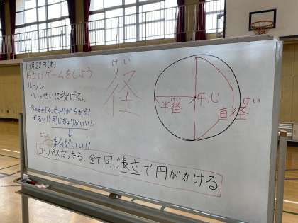 体育館で、輪投げ大会(ドッジボールコートに並んで一斉に輪を投げる)という場面設定で、実際に並んでみると「コーンまでの距離が違うので公平じゃない」と言うので、どうすれば等距離にできるのかを考える活動を通して円の定義を学ぶことができました。