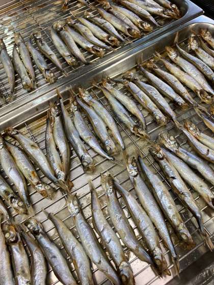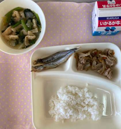 「やきししゃも」は、料理酒で下味をつけたししゃもを焼き物機で焼きます。網を敷いたホテルパンを使用することで、下側への熱のまわりもよく、仕上がります。1人当たり2尾ずつになります。骨までもすべて食べることができ、1年生もよくかんで食べていました。
