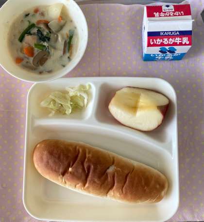 「きのこのクリームシチュー」は、エリンギ、しめじ、マッシュルームのきのこ類、青みにほうれん草を使用しています。ホワイトルウは、小麦粉と綿実油で作り、コクを出すためにクリームを加えています。