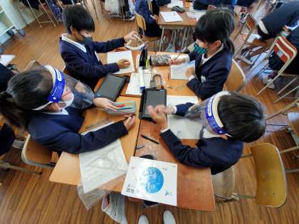 国語科の学習では、「町の幸福論」という説明文を参考に、自分たちの住む町の未来の豊かな姿を想像し、グループごとにパワーポイントを使って、プレゼンテーションを行います。