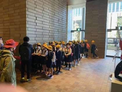 今日は5年1.2組が朝日新聞社へ社会見学にきています。電車のマナーもよくスムーズに今、到着しました。