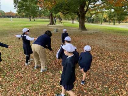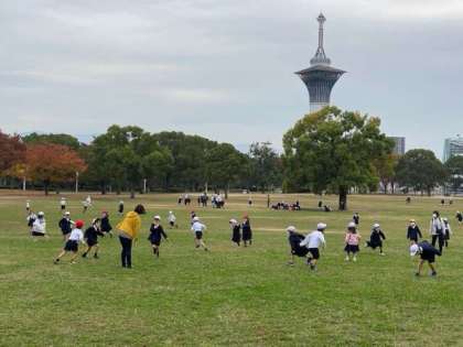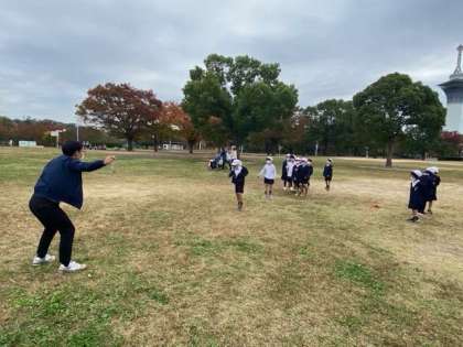 大縄をしたり鬼ごっこをしたり落ち葉を集めたりしています。