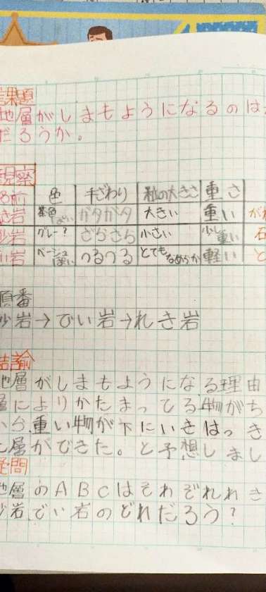 最後に泥岩・砂岩・礫岩という名前を教え、どうして地層はしまもように見えるのか、それぞれノートに考えを書きました。
