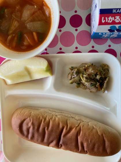 今日の給食の「りんご」は青森産のシナノスイートでした。甘くてシャキシャキした食感です。