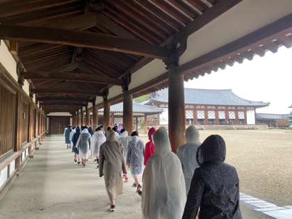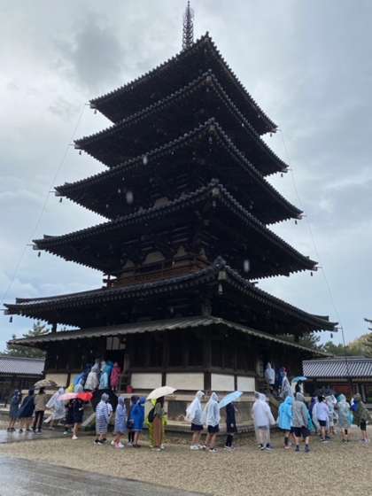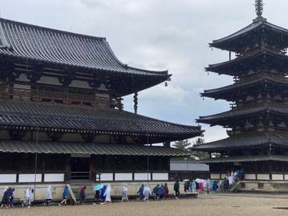 ?法隆寺に到着して見学しています。