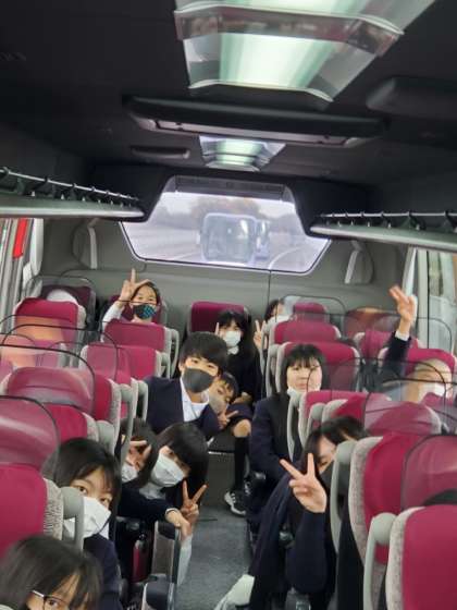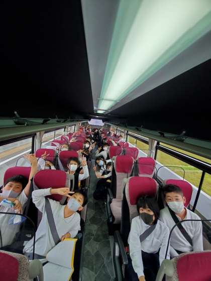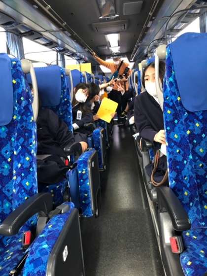 バスの車内です。コロナ対策のため、バスレクはなく、音楽を聴いています。