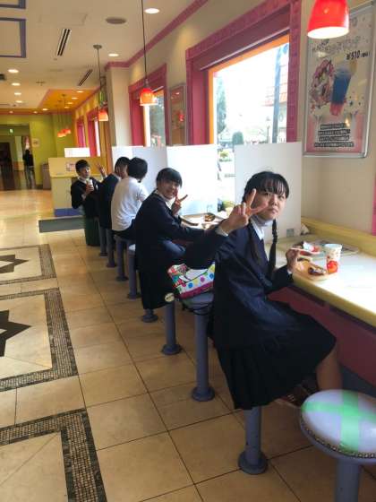予定を変更して活動班で写真を撮った後、自由行動になりました。集合時間を早めて帰りにクラス写真を撮ります。また、自由行動が始まった途端、雨がやみました。止まってた乗り物も動き出したようです^_^