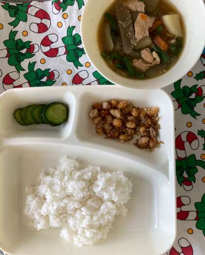 今日は、大豆とじゃこでじゃこ豆でしたが、ひじきをからませる、ひじき豆という献立も給食にはあります。