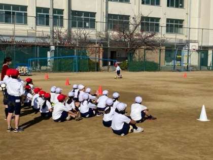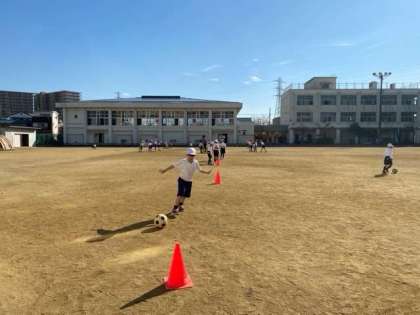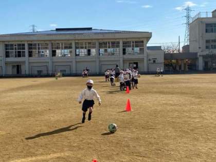 今日も快晴でしたが、1年生は運動場でサッカーをしていました。蹴ってはボールが遠ざかり、それを追いかけるという感じでしたが、授業で行う初めてのサッカーに子どもたちは楽しそうでした。