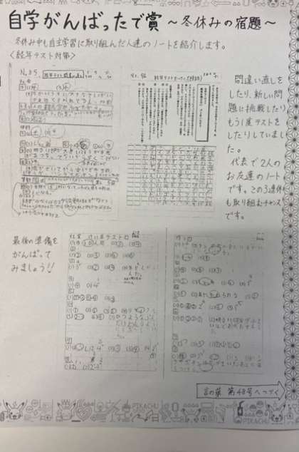 内容は自由だったのですが、来週から実施される経年テストの練習をしていたり理科の学習として「太陽」を調べていたり「初詣の由来」について調べていたりして感心しました。家庭学習の習慣化を目標に各学年で自主学習に取り組んでいますので、ご家庭でもお声がけお願いいたします。