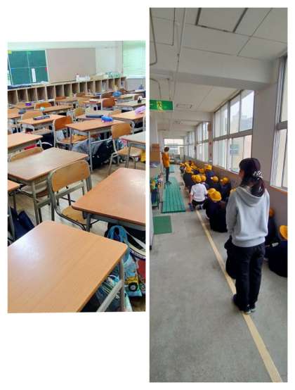 静かに落ち着いて歩きます。どの子も真剣な表情です。きびきびと避難することができました。今日は雨天なので、1階廊下までの避難です。