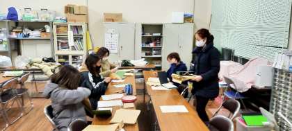 卒業式に向けて、6年生の保護者の有志が集まって活動しています。胸花、記念品、紅白まんじゅう・・・卒業式のいろいろな準備に携わっています。