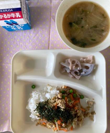 「鶏ごぼうご飯」は、しょうがで下味をつけた鶏ひき肉、つきこんにゃく、ごぼう、にんじん、グリンピースが入ったまぜごはんです。児童には大好評で、献立が鶏ごぼうご飯と知ると「めちゃくちゃお腹がすいたー!」といっている児童もいました。