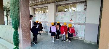 職員室前には、作品や作品の写真を展示していて、下校時や休み時間など子どもたちがたくさん集まっています。