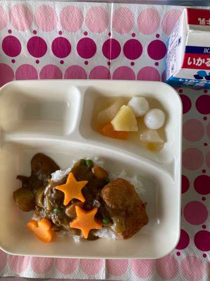 「カツカレーライス」は児童に大人気の献立です。新しいクラスでの初めての給食ですが、ほとんどのクラスが完食でした。ラッキーにんじんも入っていて、1年生も大喜びでした。