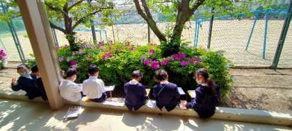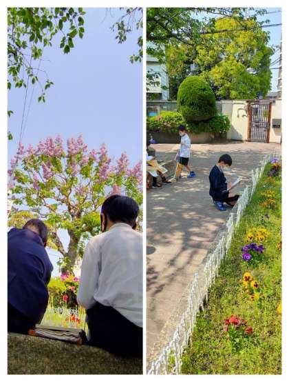 観察ボードと筆記用具を持って、2年生が何か探しています。生活科の学習で、校庭の木や草花から「春」を見つける学習です。