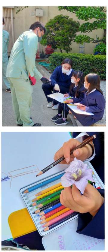 桐の花のスケッチをしている子に、管理作業員の下袴田さんが、桐の花を一つ渡していました。桐の花は、とても高い所で咲いています。近くで観察することができました。